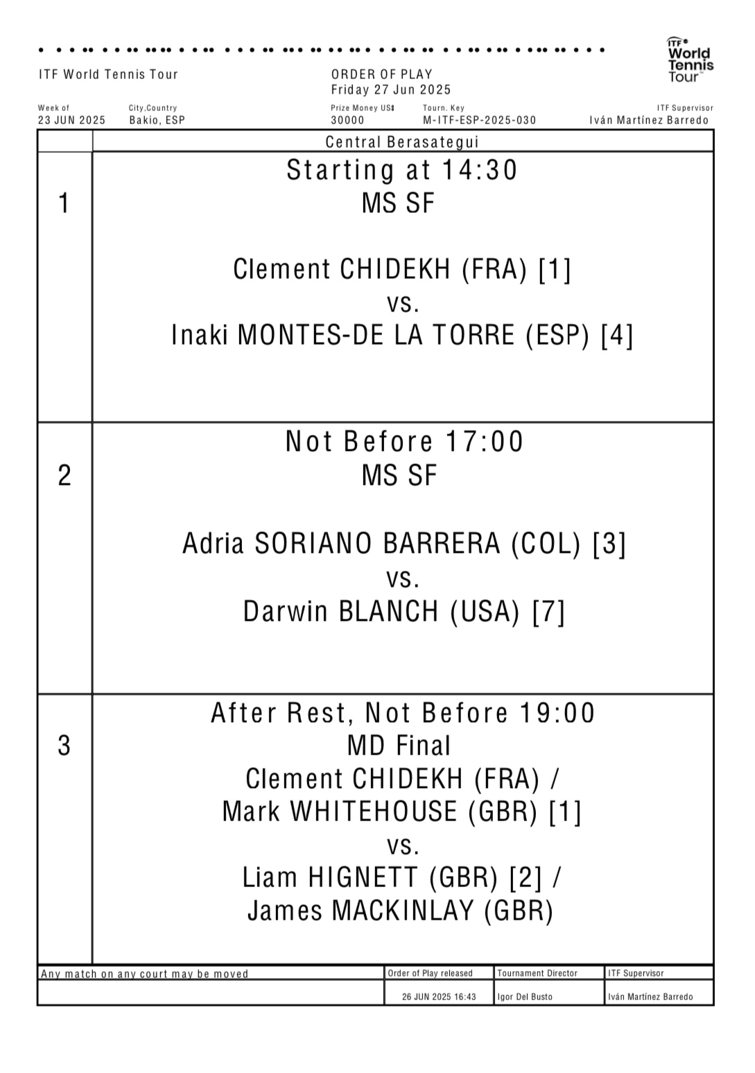 La primera semifinal enfrentará a dos tenistas que atraviesan un gran momento de forma. El francés Chidekh, que defiende título en Bakio, ha ganado el Challenger de Chisinau en Rumanía hace menos de un mes, y viene de hacer una final en el ITF de Martos la semana pasada. El navarro Montes de la Torre, por su parte, ganó la semana pasada el ITF de Laukariz y en el mes de febrero, se impuso en el ITF de Villena. En el Open Kiroleta, ha ganado todos sus partidos con mucha solidez y en sets corridos. La semifinal se disputará en la pista central a las 14:30 de la tarde. Se espera un día despejado y mucho calor para las semifinales del torneo.