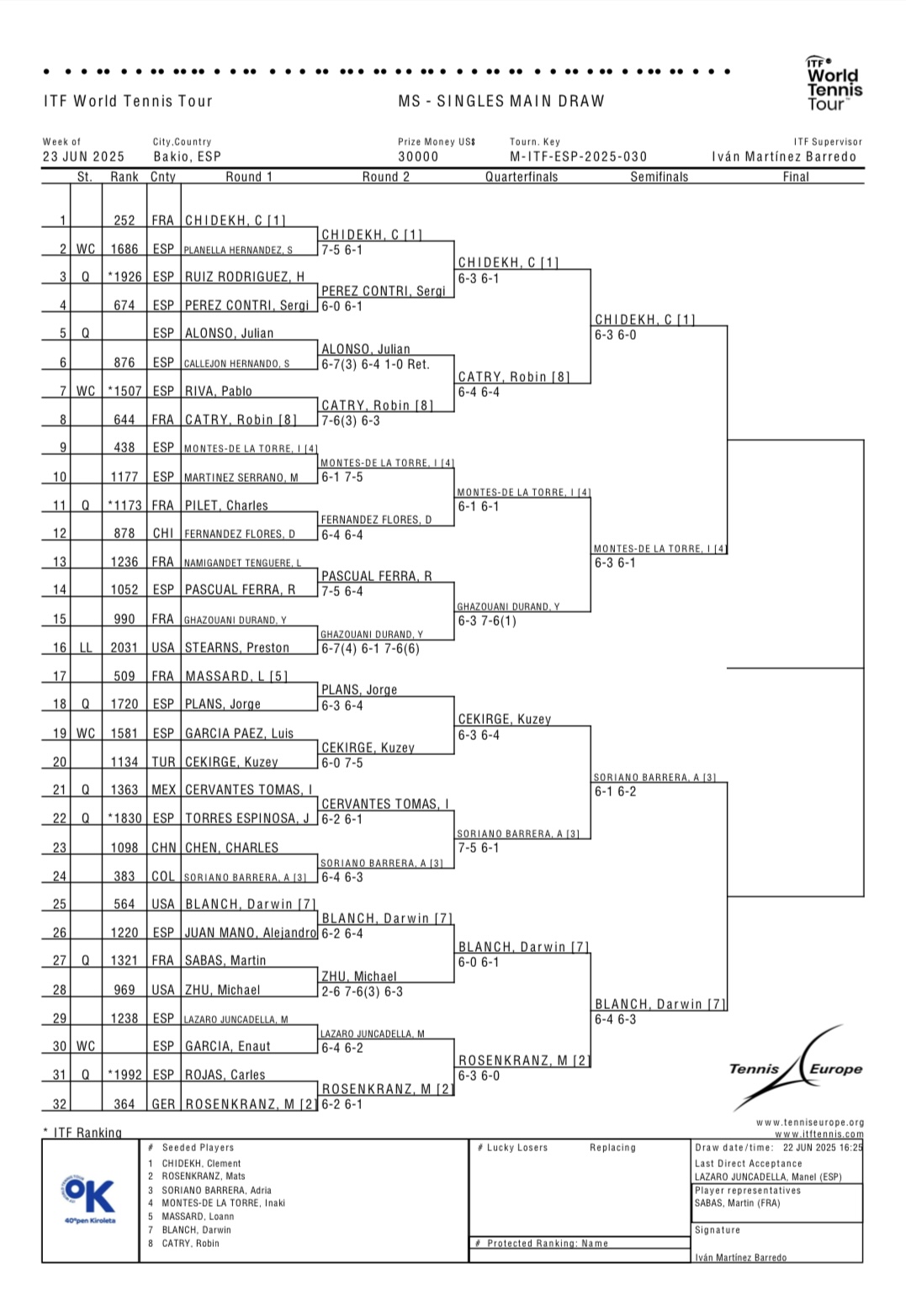 El cabeza de serie número 1, Clement Chidekh (238 ATP) ha vencido 6-3/6-0 a su compatriota Robin Catry (641 ATP). Un primer set igualado que se ha decidido al servicio. Catry no ha mostrado solidez, cediendo 4 de sus 6 juegos al saque. En el segundo set, Chidekh ha subido una marcha y no le ha permitido al rival entrar en el partido en ningún momento.