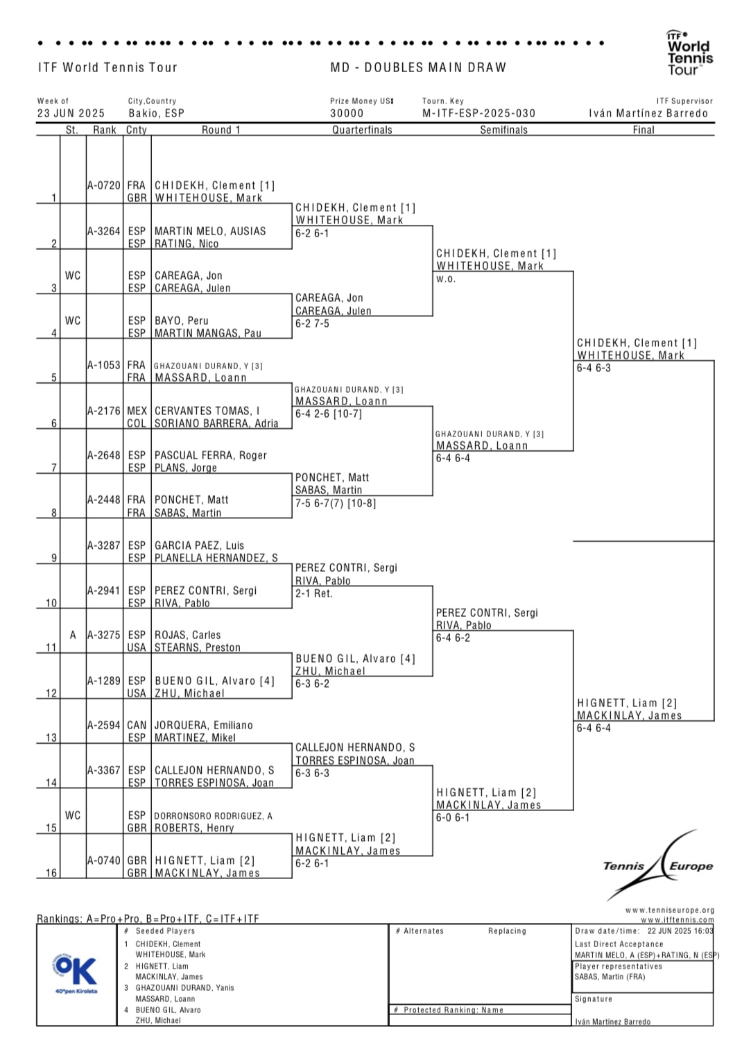 Mañana viernes, no antes de las 19:00, se disputará la final de dobles, en la que conoceremos el nombre de los tenistas que sucederán en el palmarés a Robin Bertrand y John Echeverría, ganadores en la pasada edición. El francés Chidekh junto al británico Whitehouse, tratarán de hacer valer su ranking para vencer a los británicos Hignett y MacKinlay.